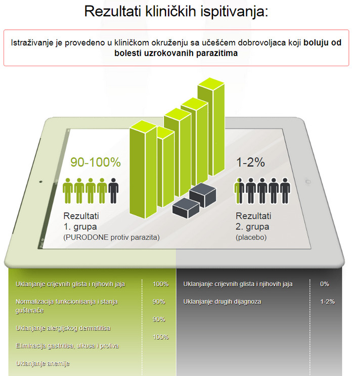 Neposredno nakon uzimanja prve tablete, aktivni sastojci počinju raditi svoj posao. Ako shematski prikažete ovaj proces, on izgleda ovako: neutralizacija odraslih crva – „vezivanje“ otrovnih tvari koje se oslobađaju u krvnu plazmu – uništavanje jajašaca – uklanjanje sve te sluzi iz probavnog trakta na prirodan način. Nakon jednog tečaja zaboravit ćete na sve neugodne simptome helminthiasis i više se nećete plašiti polaganja testova, jer je vjerovatnoća ponovne infekcije svedena na nulu: